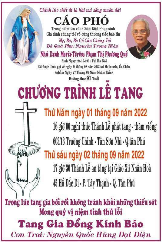 ✝Trực tiếp: Lễ an táng Bà Maria Têrêsa Phạm Thị Phương Quế | 17giờ30 | 02.09.2022 tại G.x Nhân Hòa Tháng 9 2, 2022 Admin Thánh lễ trực tuyến, Tin mới cập nhật, Video 0 ✝Trực tiếp: Lễ an táng Bà Maria Têrêsa Phạm Thị Phương Quế | 17giờ30 | 02.09.2022 tại G.x Nhân Hòa