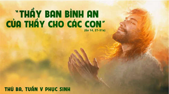 Khi ấy, Chúa Giêsu phán cùng các môn đệ rằng: “Thầy để lại bình an cho các con, Thầy ban bình an của Thầy cho các con. Thầy ban cho các con không như thế gian ban tặng. Lòng các con đừng xao xuyến và đừng sợ hãi. Các con đã nghe Thầy nói với các con rằng: Thầy đi, rồi Thầy sẽ trở lại với các con. Nếu các con yêu mến Thầy, thì các con hãy vui mừng vì Thầy về với Cha, bởi lẽ Cha trọng hơn Thầy. Giờ đây Thầy nói với các con trước khi việc xảy ra, để khi việc xảy ra, thì các con tin. Thầy không còn nói nhiều với các con nữa, vì thủ lãnh thế gian đã đến. Nó không có quyền lực gì đối với Thầy. Nhưng để cho thế gian biết rằng Thầy yêu mến Cha, thì Thầy làm như Cha đã truyền dạy”.