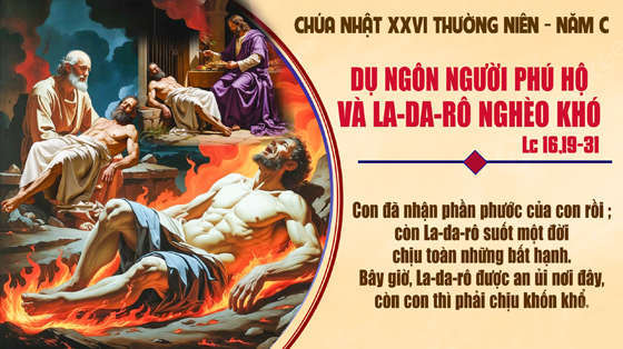 Khi ấy, Chúa Giêsu phán cùng những người biệt phái rằng: “Có một nhà phú hộ kia vận toàn gấm vóc, lụa là, ngày ngày yến tiệc linh đình. Lại có một người hành khất tên là Ladarô, nằm bên cổng nhà ông đó, mình đầy ghẻ chốc, ước được những mụn bánh từ bàn ăn rớt xuống để ăn cho đỡ đói, nhưng không ai thèm cho. Những con chó đến liếm ghẻ chốc của người ấy. Nhưng xảy ra là người hành khất đó chết và được các Thiên Thần đem lên nơi lòng Abraham. Còn nhà phú hộ kia cũng chết và được đem chôn. Trong hoả ngục, phải chịu cực hình, nhà phú hộ ngước mắt lên thì thấy đàng xa có Abraham và Ladarô trong lòng Ngài, liền cất tiếng kêu la rằng: