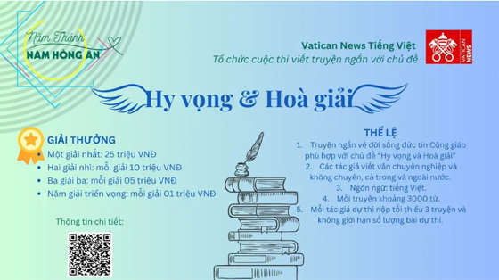 Năm Thánh 2025 với chủ đề “Những Người Hành Hương của Hy Vọng” đã và đang lan toả nhiều niềm cảm hứng sâu sắc trong Giáo hội. Nhiều cuộc hành hương ý nghĩa và nhiều hoạt động thiêng liêng vẫn diễn ra sôi động ở khắp nơi. Nhân dịp đặc biệt này, Vatican News Tiếng Việt đã phát động cuộc thi viết truyện ngắn mang tên “Hy Vọng & Hoà Giải”.Cuộc thi nhằm khuyến khích mọi thành phần dân Chúa, đặc biệt là các bạn trẻ yêu thích văn chương, tham gia vào hành trình suy tư và viết về những trải nghiệm trong đời mình qua lăng kính của hoà giải, chữa lành, và của niềm hy vọng Kitô giáo.