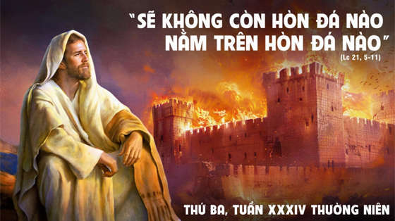 Khi ấy, có mấy người trầm trồ về đền thờ được trang hoàng bằng đá tốt và những lễ vật quý, nên Chúa Giêsu phán rằng: “Những gì các con nhìn ngắm đây, sau này sẽ đến ngày không còn hòn đá nào nằm trên hòn đá nào mà chẳng bị tàn phá”. Bấy giờ các ông hỏi Người rằng: “Thưa Thầy, bao giờ những sự ấy sẽ xảy ra, và cứ dấu nào mà biết những sự đó sắp xảy đến?” Người phán: “Các con hãy ý tứ kẻo bị người ta lừa dối: vì chưng, sẽ có nhiều kẻ mạo danh Thầy đến mà tự xưng rằng: “Chính ta đây và thời gian đã gần đến”, các con chớ đi theo chúng. Khi các con nghe nói có chiến tranh loạn lạc, các con đừng sợ: vì những sự ấy phải đến trước đã, nhưng chưa phải là hết đời ngay đâu”.