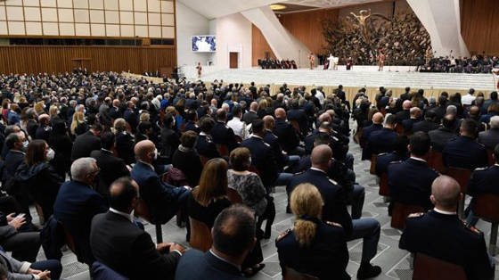 Đức Thánh Cha Phanxicô khuyến khích các nhân viên an ninh xem công việc của họ như một lời nhắc nhở thường xuyên về những giá trị cao nhất – những giá trị nhân văn và thiêng liêng cần được đón nhận và làm chứng hàng ngày. Ngài cũng hy vọng rằng công việc khó khăn của họ, được hoàn thành với sự hy sinh và chấp nhận nguy hiểm, sẽ được thúc đẩy bởi đức tin Ki-tô giáo, là “kho tàng thiêng liêng quý giá nhất” được ủy thác cho gia đình họ để truyền lại cho con cái. (CSR_6979_2020)
