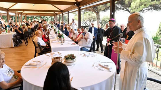 Trước bữa trưa với những người nghèo được Caritas Albano giúp đỡ, tại khu vườn của Dinh Giáo hoàng ở Castel Gandolfo, Đức Thánh Cha đã chào những người hiện diện: chúng ta luôn nhớ rằng mỗi người đều là hình ảnh của Thiên Chúa, và “chúng ta gặp được sự hiện diện của Thiên Chúa nơi từng người”. Cùng nhau tham dự lễ bẻ bánh là Thánh lễ, “nhưng cũng cùng nhau chia sẻ những hồng ân mà Chúa đã ban”.Bữa ăn trưa của Đức Thánh Cha với khoảng 110 người nghèo được giáo phận Albano Laziale và “Làng Laudato si’”, phối hợp với Bộ Phục vụ Phát triển Con người Toàn diện, tổ chức trong khung cảnh thiên nhiên đẹp của các khu vườn của Dinh Giáo hoàng ở Castel Gandolfo. Những người nghèo này được Caritas Albano trợ giúp, họ là những người nghèo cả về kinh tế lẫn xã hội.