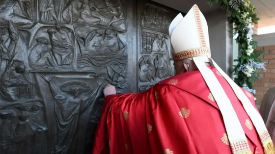 Đức Thánh Cha Phanxicô đang ngồi, với lễ phục màu đỏ, trước cánh cửa đồng phía bên phải Nhà thờ Kinh Lạy Cha, bên trong nhà tù Rebibbia. Sau đó, ngài đứng lên và gõ cánh cửa đồng sáu lần, cửa được mở ra. Với những bước chậm rãi, ngài đi qua Cửa Thánh tại nhà tù này. Lần đầu tiên trong lịch sử, một Đức Giáo Hoàng mở Cửa Thánh không phải trong một vương cung thánh đường mà bên trong một nhà tù. Đức Thánh Cha Phanxicô muốn làm điều đó để mang món quà hy vọng – chủ đề của cả Năm Thánh – đến một nơi bị giam cầm và khó khăn, nơi hy vọng rất dễ bị đánh mất.