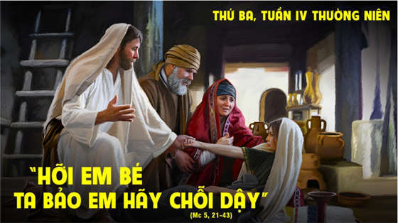 Người còn đang nói, thì người nhà đến nói với ông trưởng hội đường rằng: “Con gái ông chết rồi, còn phiền Thầy làm chi nữa?” Nhưng Chúa Giêsu đã thoáng nghe lời họ vừa nói, nên Người bảo ông trưởng hội đường rằng: “Ông đừng sợ, hãy cứ tin”. Và Người không cho ai đi theo, trừ Phêrô, Giacôbê và Gioan, em Giacôbê. Các ngài đến nhà ông trưởng hội đường. Và Chúa Giêsu thấy người ta khóc lóc kêu la ồn ào, Người bước vào và bảo họ: “Sao ồn ào và khóc lóc thế? Con bé không chết đâu, nó đang ngủ đó”. Họ liền chế diễu Người. Nhưng Người đuổi họ ra ngoài hết, chỉ đem theo cha mẹ đứa bé và những môn đệ đã theo Người vào chỗ đứa bé nằm. Và Người cầm tay đứa nhỏ nói rằng: “Talitha, Koumi!”, nghĩa là: “Hỡi em bé, Ta truyền cho em hãy chỗi dậy!” Tức thì em bé đứng dậy và đi được ngay, vì em đã được mười hai tuổi. Họ sửng sốt kinh ngạc. Nhưng Người cấm ngặt họ đừng cho ai biết việc ấy, và bảo họ cho em bé ăn.