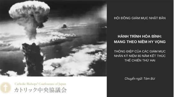 Ngày 17 tháng 6 năm 2025, Hội đồng Giám mục Nhật Bản đã gửi thông điệp nhân kỷ niệm 80 năm kết thúc Thế chiến thứ hai với chủ đề: Hành trình hòa bình – Mang theo niềm hy vọng. Thông điệp này đặc biệt gửi đến các bạn trẻ. Sau đây là toàn văn bản dịch Việt ngữ:HỘI ĐỒNG GIÁM MỤC NHẬT BẢN