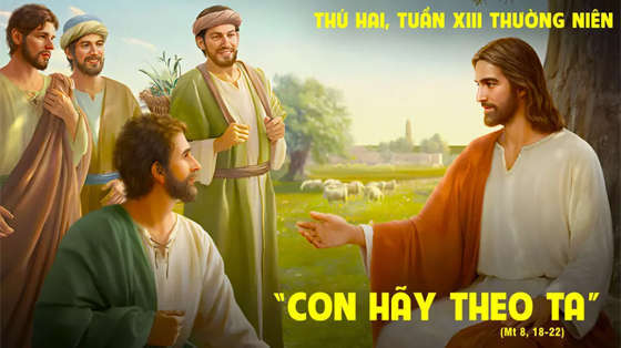 Khi ấy, Chúa Giêsu thấy đám đông dân chúng vây quanh Người, thì Người ra lệnh sang qua bờ bên kia. Một luật sĩ đến thưa Người rằng: “Lạy Thầy, bất cứ Thầy đi đâu, con cũng xin theo Thầy”. Chúa Giêsu trả lời: “Con chồn có hang, chim trời có tổ, Con Người không có chỗ gối đầu”. Một môn đệ khác thưa Người rằng: “Thưa Thầy, xin cho phép con về chôn cất cha con trước đã”. Chúa Giêsu trả lời: “Con hãy theo Ta, và hãy để kẻ chết chôn kẻ chết”.