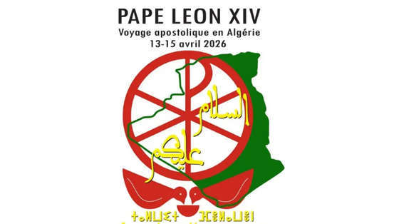 Logo cho chuyến viếng thăm Algeria, từ ngày 13-15/4/2026, lấy cảm hứng từ một bức phù điêu cổ, có hình hai con chim bồ câu đang uống nước từ cùng một chiếc cốc, biểu tượng của hòa bình và sự hiệp thông, cùng với biểu tượng “Chi Rho” của Kitô giáo và bản đồ Algeria.