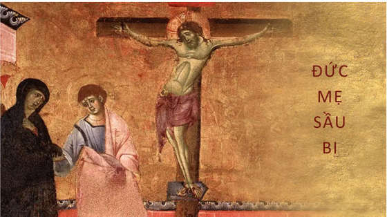 Đứng gần thập giá Đức Giêsu, có thân mẫu Người, chị của thân mẫu, bà Maria vợ ông Cơlôpát, cùng với bà Maria Mácđala. Khi thấy thân mẫu và môn đệ mình thương mến đứng bên cạnh, Đức Giêsu nói với thân mẫu rằng: “Thưa Bà, đây là con của Bà.” Rồi Người nói với môn đệ: “Đây là mẹ của anh.” Kể từ giờ đó, người môn đệ rước bà về nhà mình. (Ga 19,25-27).