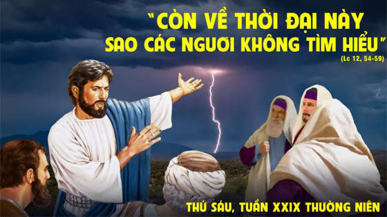 Khi ấy, Chúa Giêsu phán bảo dân chúng rằng: “Khi các ngươi xem thấy đám mây nổi lên ở phía tây, lập tức các ngươi nói rằng: Trời sắp mưa; và sự thật xảy ra như thế. Và khi gió nam thổi đến, thì các ngươi nói: Trời sắp nóng nực. Và việc đã xảy ra như thế. Hỡi những kẻ giả hình, các ngươi biết tìm hiểu diện mạo của trời đất, còn về thời đại này, sao các ngươi không tìm hiểu? Tại sao các ngươi không tự mình phê phán điều gì phải lẽ? Thế nên, khi ngươi cùng với kẻ đối phương ra trước mặt quan quyền, thì đang lúc đi dọc đường, ngươi hãy cố lo liệu cho ổn thoả với nó đi, kẻo nó lôi ngươi đến trước quan toà, và quan toà trao ngươi cho lý hình và lý hình tống ngươi vào ngục. Ta bảo cho ngươi hay, ngươi sẽ không thể ra khỏi đó cho đến khi nào trả xong đồng xu cuối cùng”.