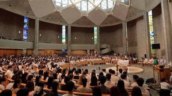 Thánh lễ lúc 3 giờ chiều Chúa nhật hằng tuần tại ngôi thánh đường gần ga JR Yotsuya, quận Kojimachi, Tokyo luôn sống động, với những đứa trẻ nhỏ chạy xung quanh nhà thờ.