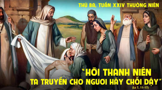 Khi ấy, Chúa Giêsu đến một thành gọi là Naim. Các môn đệ và đám đông dân chúng cùng đi với Người. Khi Người đến gần cửa thành, thì gặp người ta đang khiêng đi chôn người con trai duy nhất của một bà goá kia và có đám đông dân thành đi đưa xác với mẹ nó. Trông thấy bà, Chúa động lòng thương và bảo bà rằng: “Ðừng khóc nữa”. Ðoạn tiến lại gần, Người chạm đến quan tài và những người khiêng đứng lại. Bấy giờ Người phán: “Hỡi thanh niên, Ta truyền cho ngươi hãy chỗi dậy”. Người chết liền ngồi lên và bắt đầu nói. Rồi Người trao lại cho mẹ nó.