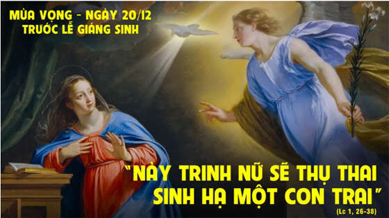 Khi ấy Thiên thần Gabriel được Chúa sai đến một thành xứ Galilêa, tên là Nadarét, đến với một trinh nữ đã đính hôn với một người tên là Giuse, thuộc chi họ Ðavít, trinh nữ ấy tên là Maria. Thiên thần vào nhà trinh nữ và chào rằng: “Kính chào Bà đầy ơn phước, Thiên Chúa ở cùng Bà. Bà được chúc phúc giữa các người phụ nữ”. Nghe lời đó, Bà bối rối và tự hỏi lời chào đó có ý nghĩa gì. Thiên thần liền thưa: “Maria đừng sợ, vì đã được nghĩa với Chúa. Này Bà sẽ thụ thai, sinh một con trai và đặt tên là Giêsu. Người sẽ nên cao trọng và được gọi là con Ðấng Tối Cao. Thiên Chúa sẽ ban cho Người ngôi báu Ðavít, tổ phụ Người. Người sẽ cai trị đời đời trong nhà Giacóp, và triều đại Người sẽ vô tận”.