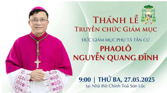 Thánh lễ truyền chức Giám mục cho Đức cha Phụ tá tân cử Phaolô Nguyễn Quang Đĩnh sẽ được cử hành vào lúc 09g00 ngày 27/5/2025 tại Nhà thờ Chính tòa Sơn Lộc, Giáo phận Hưng Hóa.