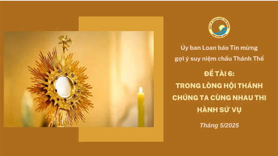 Nhằm khơi dậy ý thức truyền giáo nơi các cộng đoàn tín hữu, Ủy ban Loan báo Tin mừng trong “Kế hoạch thực hiện sống Năm thánh 2025 – Cùng nhau Loan báo Tin mừng” đề nghị mỗi giáo phận chọn một ngày theo chu kỳ tuần/tháng/năm để chầu Thánh Thể cầu nguyện cho việc truyền giáo. Ủy ban Loan báo Tin mừng sẽ có bài gợi ý suy niệm chầu Thánh Thể mỗi tháng. Sau đây là bài gợi ý suy niệm tháng 05/2025.ỦY BAN LOAN BÁO TIN MỪNG – HỘI ĐỒNG GIÁM MỤC VIỆT NAM
