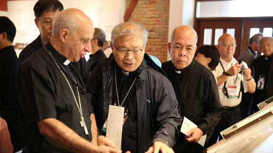 Đức Hồng y Andrew Yeom Soo-jung (giữa), tổng giám mục của Seoul, hướng dẫn Đức Tổng Giám mục Rino Fisichella (trái), chủ tịch Hội đồng Giáo hoàng Cổ vũ Tân Phúc âm hóa, và Đức Tổng Giám mục Romulo Valles của Davao ở Philippines trong chuyến tham quan một viện bảo tàng ở Seoul hôm 11-9. Ảnh: Joe Torres