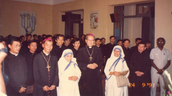 Đức Hồng y Thuận – khi đó còn là Tổng Giám Mục – gặp Mẹ Thánh Têrêsa Calcutta trong chuyến viếng thăm đầu tiên của Mẹ tới Việt Nam với tư cách Bề trên Tổng quyền Dòng Thừa Sai Bác Ái, năm 1991. (Ảnh: Bà Elisabeth Thu Hồng cung cấp)